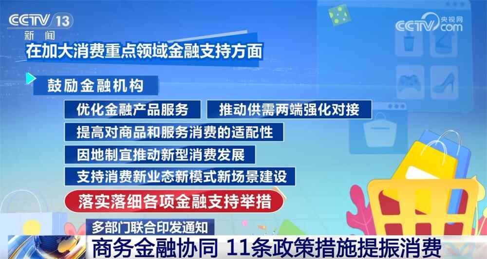 央视网消息:商务部记者14日获悉,为加强商务金融协调,加大促进消费力度,商务部、人民银行、金融监管总局近日联合提出加大对消费重点领域支持力度的11条政策措施,多措并举加强和扩大消费。在加大对主要消费领域的金融支持方面,鼓励金融机构重点围绕商品消费升级、扩大服务消费、培育新型消费、转变多样化消费场景、消费辅助、优化金融产品和服务、促进加强供需衔接、根据高效消费条件提高服务的地方适应性和消费等五个主要领域。支持推动消费新业态、新模式、新场景发展,落实各项金融支持措施。在扩大政金融企对接合作方面,鼓励“政金融企”合力扩大消费,开展多层次、多渠道、多元化的消费促进和信息共享活动,提供精准对接服务,用足相关政策红利,更好满足相关经营主体和消费者的需求。在深化工商金融系统合作方面,鼓励有条件的地方完善沟通合作机制,加强财政资金、信贷资金、社会资本联动,细化具体实施细则,共同打造好政策“一揽子”,为惠及民生、促进消费提供更多支持。多部门国务院办公厅印发联合通知:加大金融支持力度,进一步惠及民生、促进消费。围绕商品消费、服务消费、新消费等重点领域,商务部、人民银行等部门明确提出加大金融支持力度,进一步惠及民生、促进消费的新政策措施。转向商品消费升级,推动金融机构、平台、各大商户合作,进军商超,完善分期支付、数字人民币等产品和服务模式,更好满足消费者的兑换需求。落实个人消费贷款额度、期限、利率等不同政策,加快发展个人消费贷款业务。对于提前清偿债务产生的违约金,将给予适用的豁免和免除正在执行汽车以旧换新流程。扩大服务消费,转型金融产品和服务,包容更多消费场景和消费生态。鼓励和引导金融机构在自主决策的基础上,积极向服务消费领域、养老领域的经营主体提供债务。培育新型消费,积极探索支持首轮经济、绿色消费、“人工智能+消费”等新消费业态新模式的有效金融措施。此外,新政策措施提出完善消费品以旧换新服务平台、扩大金融机构参与范围。鼓励商家和平台发放消费券,提供更多低息、免息分期等优惠,提升消费者价值感。